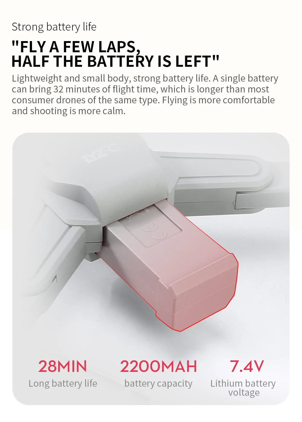 - 28 minutes maximum flight time powered by a 7.4V 2200mAh lithium battery
