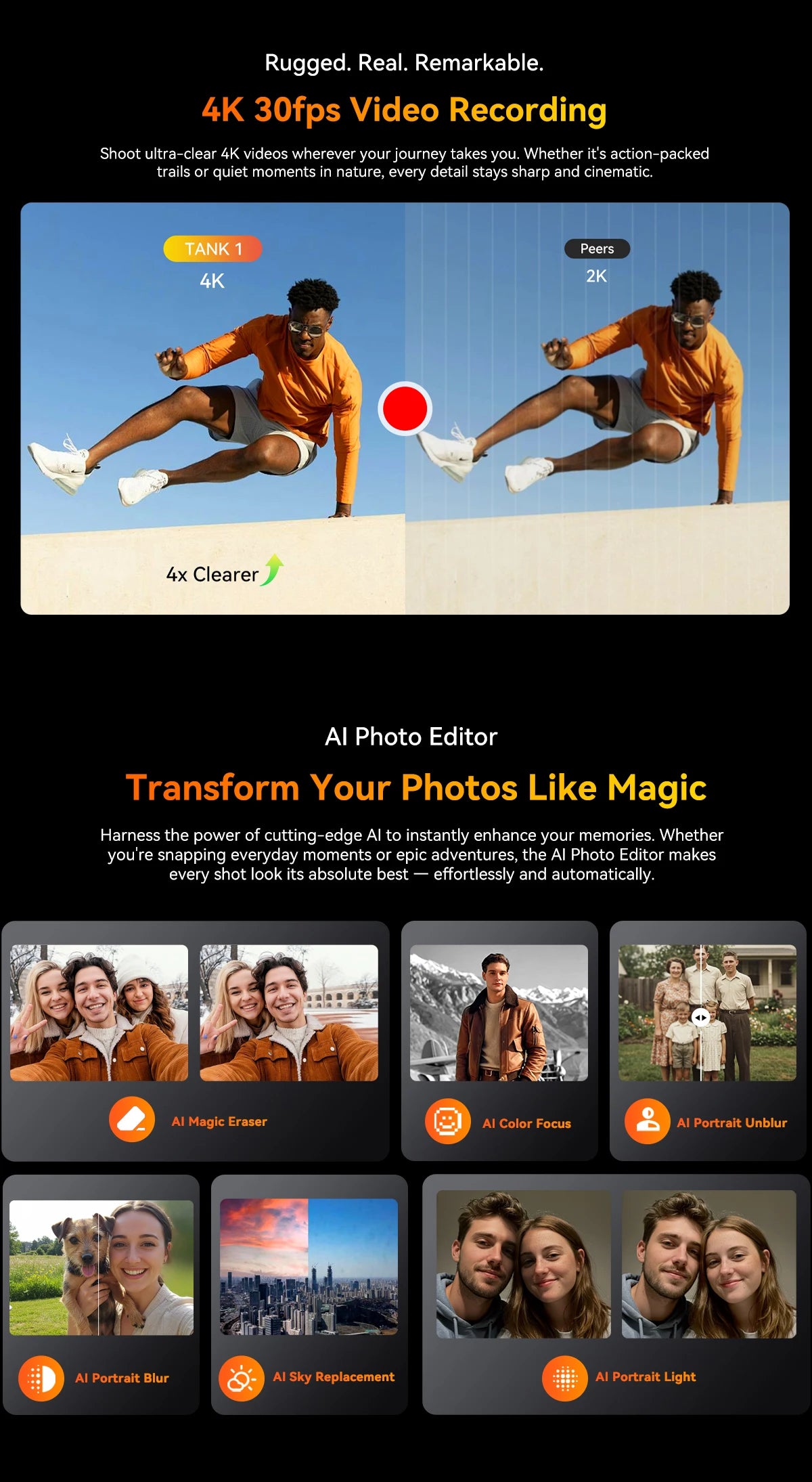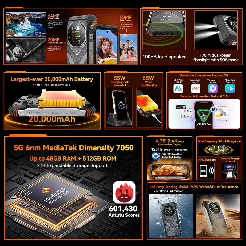 Powered by the MediaTek Dimensity 7050 chipset built on a 6nm process, this smartphone delivers seamless 5G connectivity and efficient multitasking with up to 12GB RAM, expandable to 24GB through RAM expansion technology. The 20,000mAh battery, paired with 55W fast charging, offers unmatched endurance for users on the go. The camera system features a 64MP main sensor alongside a 20MP night vision lens and a 50MP front camera, meeting the needs of both day and low-light photography. Finally, the Oscal TANK 1’s rugged design combined with glove mode, NFC support, dual LED flashlights, and comprehensive navigation systems make it an ideal choice for adventurers and professionals alike.
