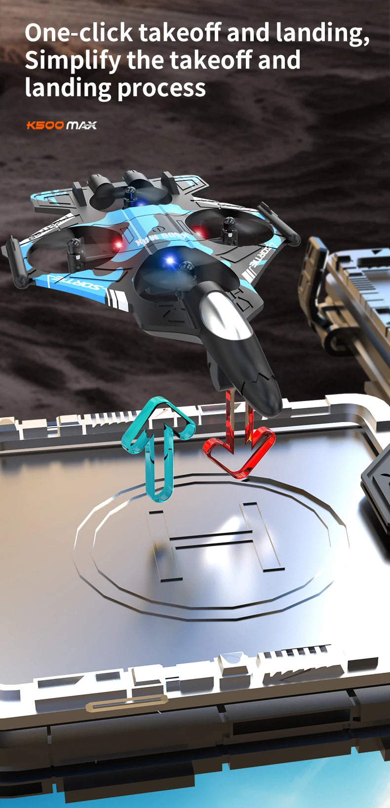 K500 MAX is equipped with a screen, a 2.4G remote-controlled aerobatic gliding fighter jet and a 360° rolling drone toy gift